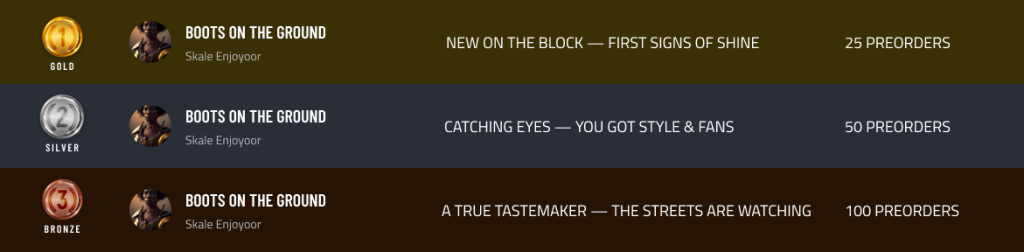 Fans are ranked by pre-orders. The top fan of the week takes the spotlight at the top of the page and gets the hero section. Let the battle of the bold begin.